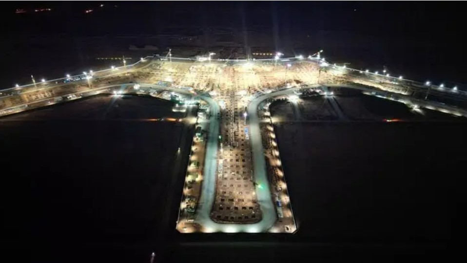 Nhà ga hoa sen của dự án sân bay Long Thành đang dần thành hình sau hơn 3 tháng thi công, ban đêm ánh sáng từ công trường tạo nên một bức tranh ấn tượng.